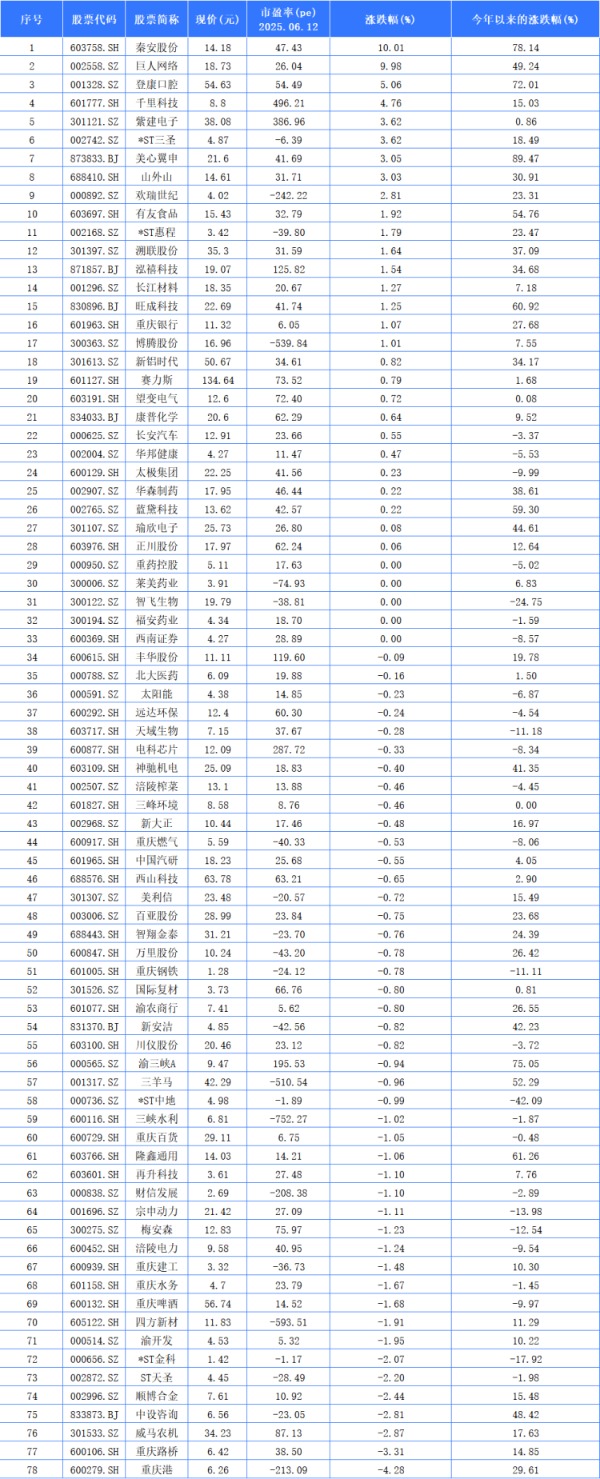 6月12日51我也要配资,78家重庆A股上市公司中有28家上涨。